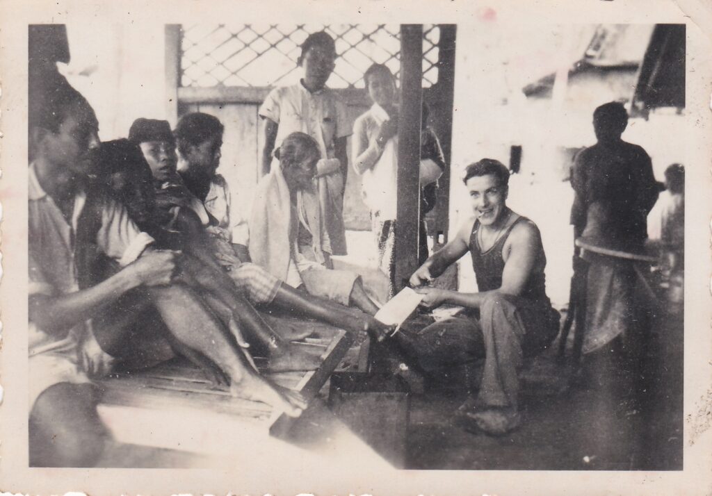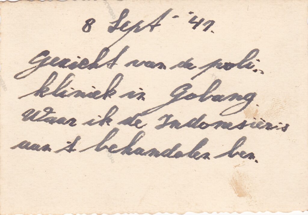 Gewapend met een fototoestel maakte Piet of zijn kameraden talloze zwart-witfoto’s — vaak kleine formaten met bewegingsonscherpte — die een levendige indruk geven van het leven in Indië. Fotorolletjes werden in grotere plaatsen ontwikkeld. De afdrukken, soms zes of acht per pagina, werden met fotohokjes opgeplakt in albums, meestal voorzien van datum en bijschrift. Op de foto hieronder ziet u dat hij spreekuur had voor de plaatselijke bevolking. Dat had hij vaak. Hij heeft heel veel Indinesiëers behandeld. Behandeling van plaatselijke bevolking loopt als rode draad door het boek.